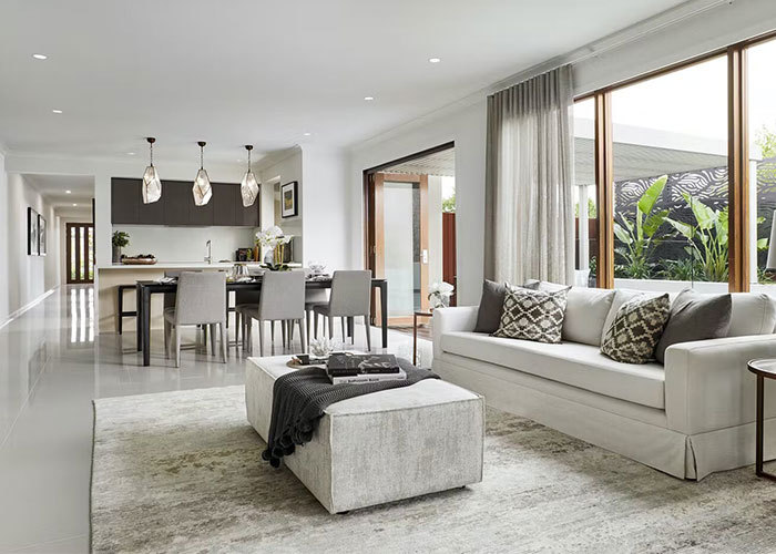 في الجزء الخلفي من المنزل توجد غرفة معيشة مريحة، منفصلة قليلاً عن منطقة الطعام والمطبخ.أو وقت العائلة في نهاية اليوم.