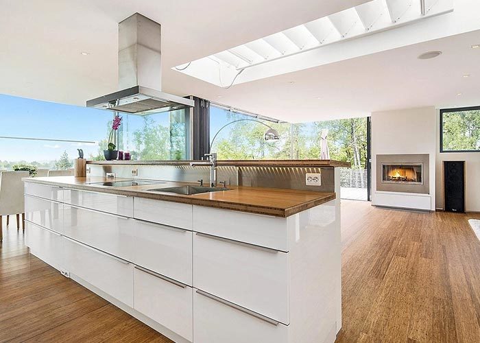 تم تخصيص الساق الأقصر من "L" للمناطق العامة للمنزل. هنا، يعطي التصميم الأولوية للانفتاح والضوء الطبيعي.