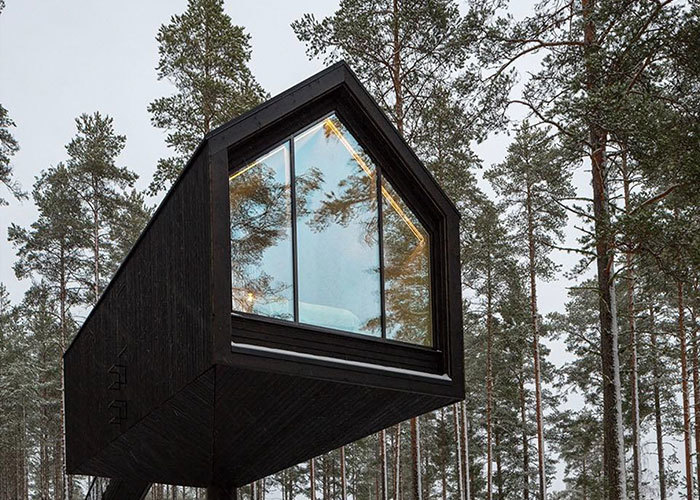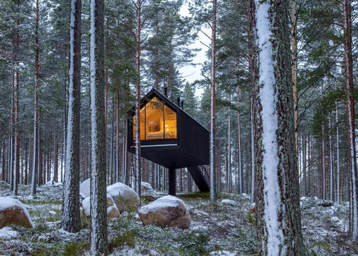 Upon entering, the dining area greets visitors first. Positioned back-to-back with the dining space, a bathroom occupies the adjacent zone, creating a practical separation of functions. Toward the far end of the cabin, a bedroom sits in a more private position. A large floor-to-ceiling glass panel faces outward, drawing the natural scenery into the interior and allowing light to move through the space throughout the day.